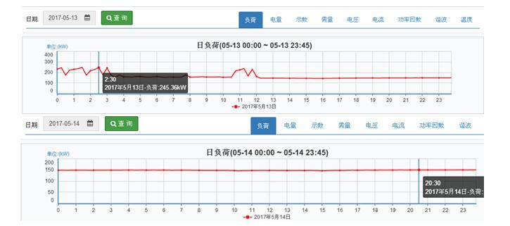 5月13~14日(周末),明显可以看出存在43个小时待机负荷,造成电能浪费约6450kWH,直接经济损失约5200元。