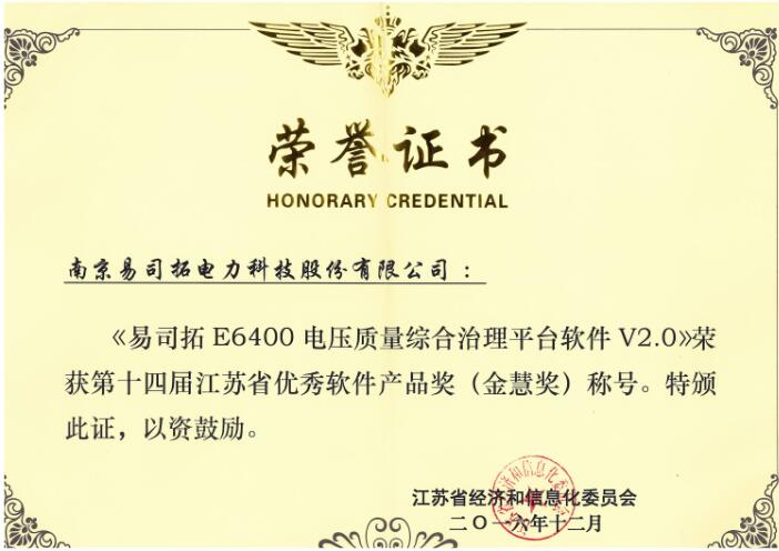“金慧奖”是江苏省政府批准设立、由省信息产业厅组织实施的江苏省唯一优秀软件产品政府奖,也是江苏省软件产品的最高奖项。易司拓E6400电压质量综合治理平台软件建立基于各源系统配电网、电网拓扑、设备参数、运行数据的电压质量大数据监测分析平台,实现数据质量评价与清洗治理;建立电压质量全过程管理指标体系,发现并定位问题;根据仿真计算实现治理方案的辅助决策与优选,生成电压质量综合治理方案;同时系统提供治理设备监控、治理效果评估等辅助功能。
