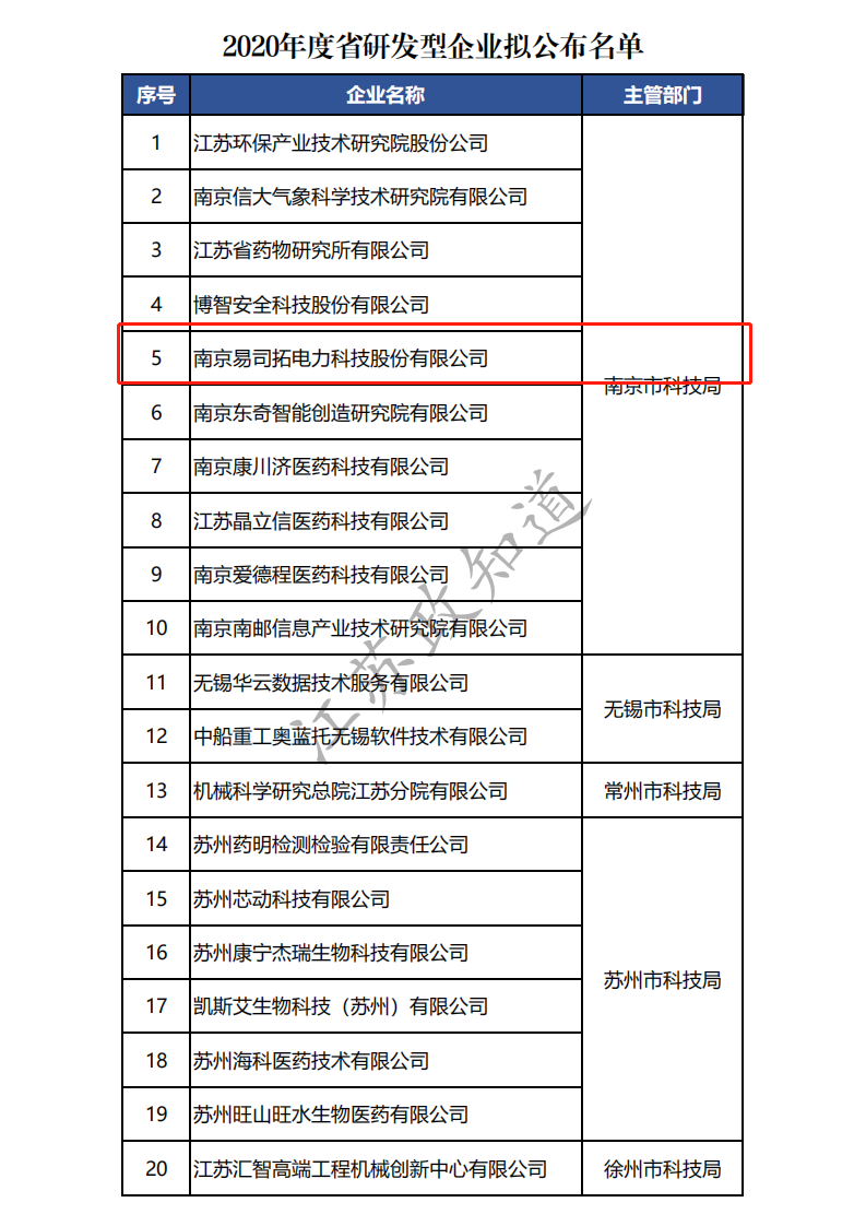 近日,根据《关于组织申报2020年度江苏省研发型企业的通知》,经组织申报、初审、专家评审和现场答辩等程序,南京易司拓电力科技股份有限公司荣获2020年度江苏省研发型企业称号!