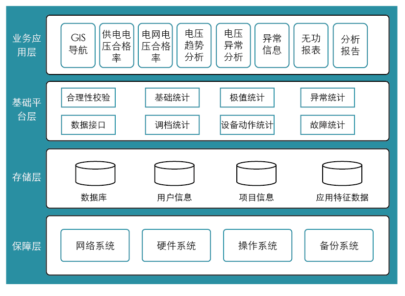系统采用模块化、层次化设计,支持大规模分布式部署,充分保证了系统的可用性及可扩展性。整个方案包括保障层的网络及操作系统等软硬件支撑,存储层的用户数据、运行数据存储,基础平台层的数据校验、数据访问接口、数据统计等,业务应用层的GIS导航、电压异常分析、电压趋势分析、无功报表等应用功能。