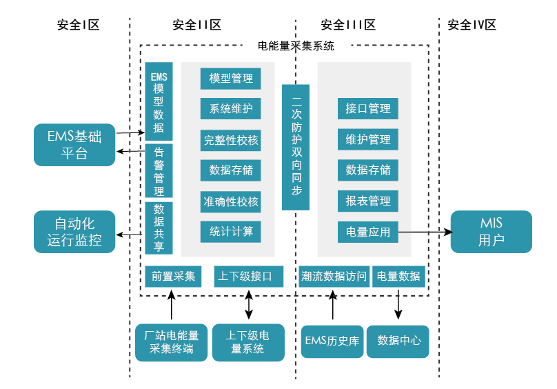 ■系统自身直接采集厂站电能量采集终端数据的前置采集应用部署在安全II区,通过调度数据网、程控电话网与厂站电能量采集终端通信实现数据采集和终端维护;