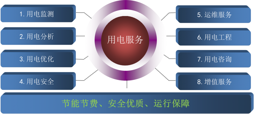 用电服务业务围绕用户侧的用电问题,进行用电监测、用电分析、用电优化、用电安全、运维服务、用电工程、用电咨询、其他增值八个方面的用电服务,保障安全优质用电,实现节省能耗,降低费用。