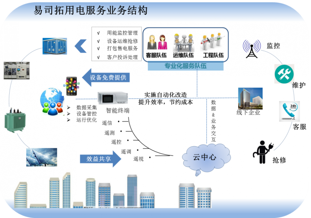 易司拓电力用户服务通过线上云平台监测分析和线下电力专家现场服务,对用户用电环节、用电方案、用电行为进行全面诊断和治理,降低电力运行成本,提高企业效益。